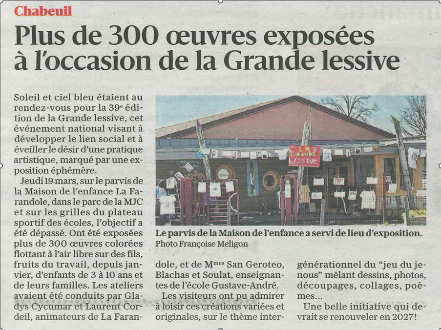 THÈME DU MOIS DE MARS 2026 – PROJET LA GRANDE LESSIVE chez les marins d’eau douce en partenariat avec les classes de CP/CE1 de l’école Gustave André.